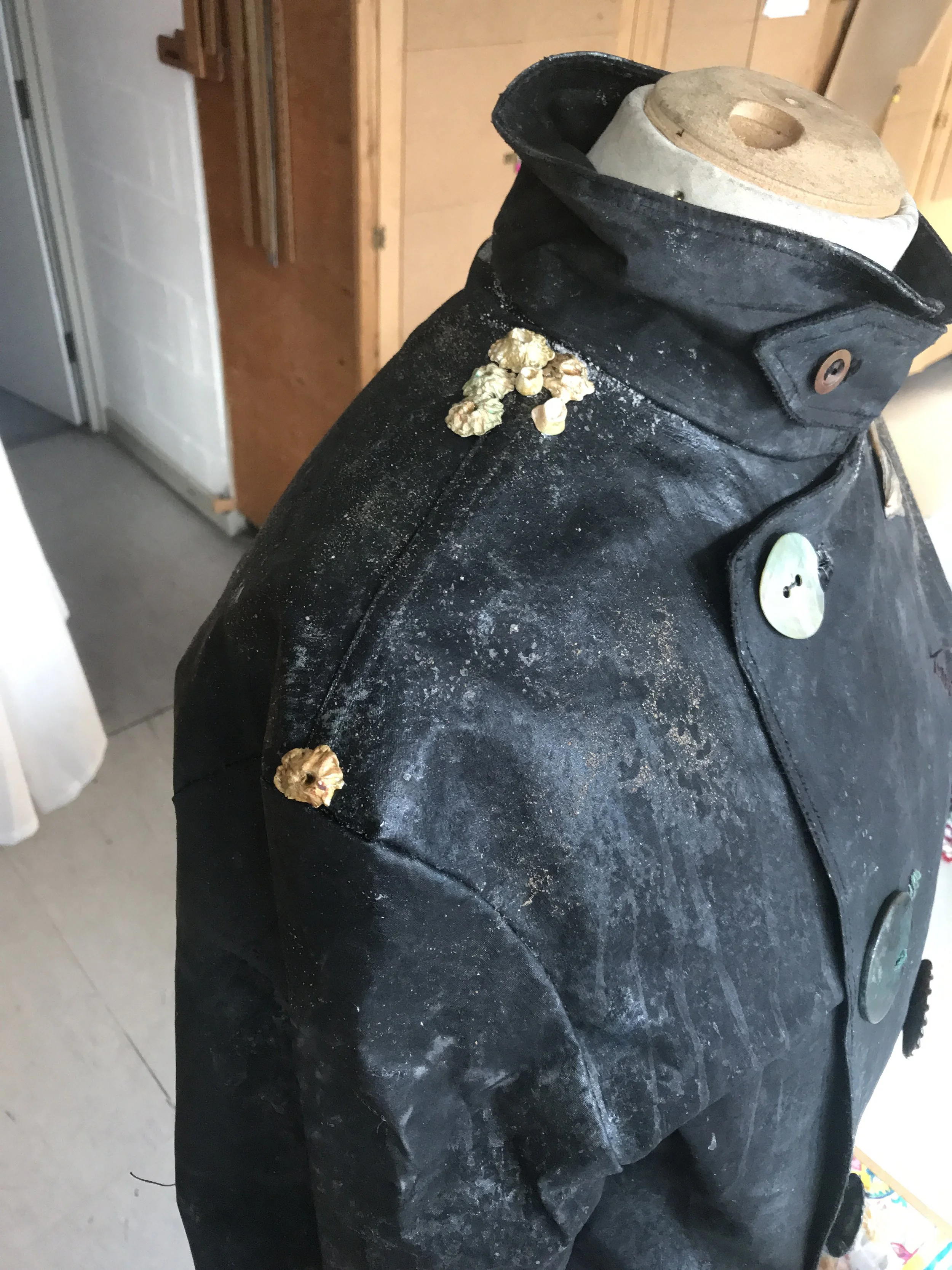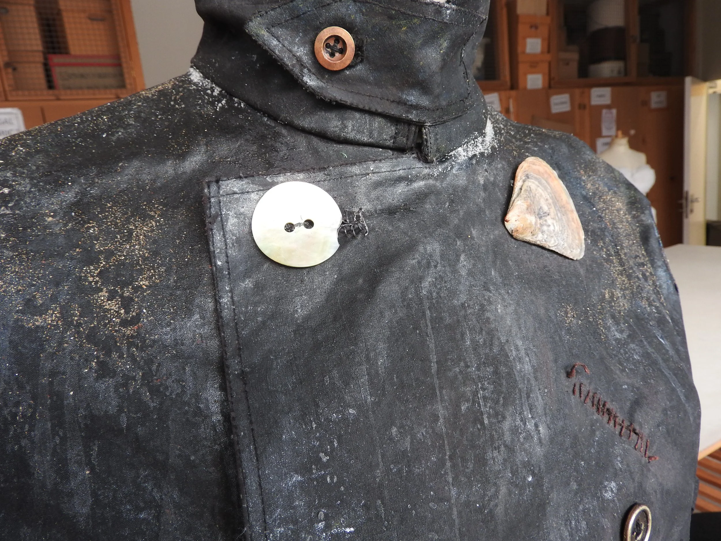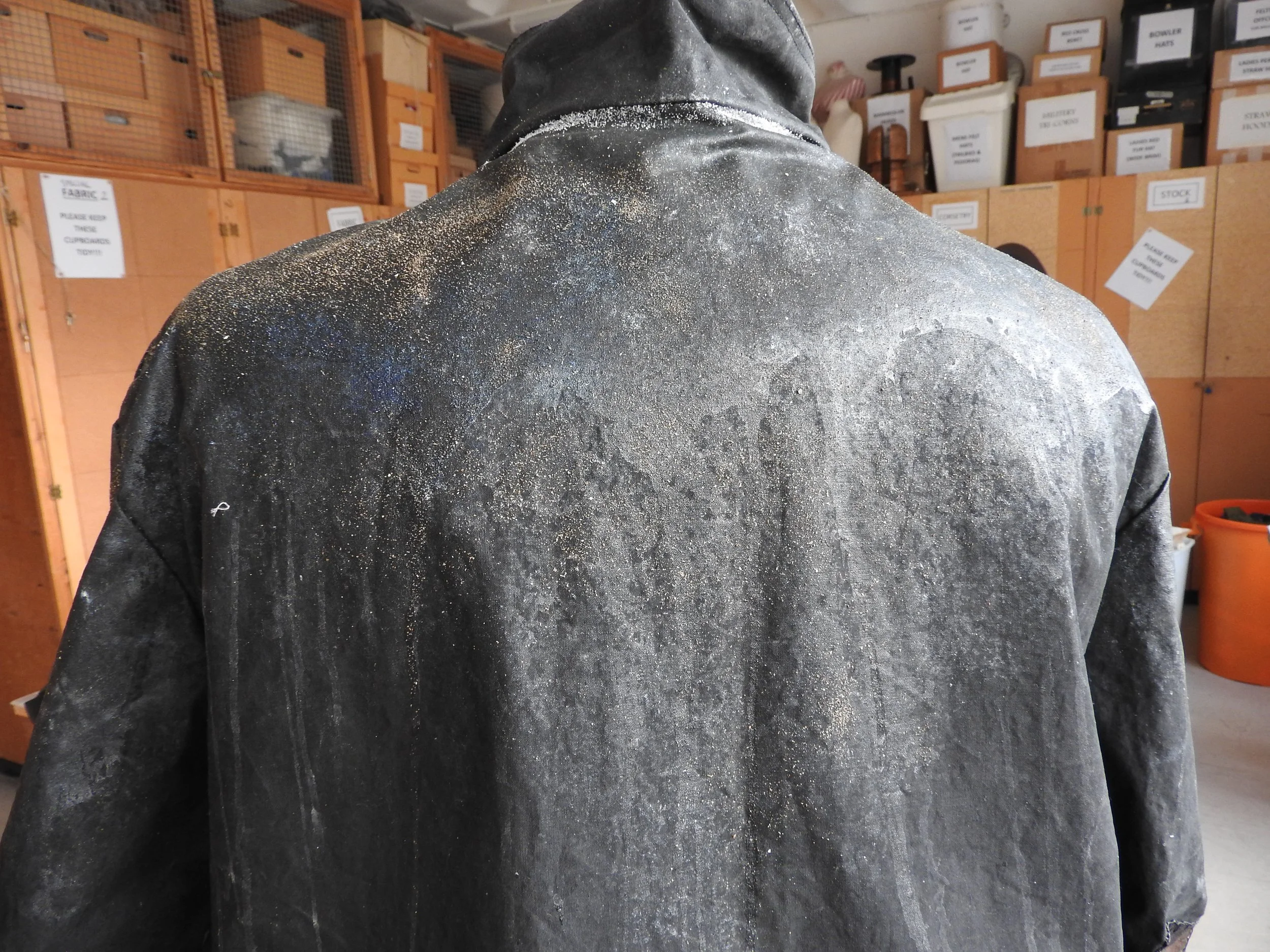 Breakdown on The Flying Dutchman; weathering from his long years at sea, roughly mended areas, salt bleaching, sand and barnacles clinging to the oilcloth and a treatment to create ‘wet’ areas, drips and spray splatters.