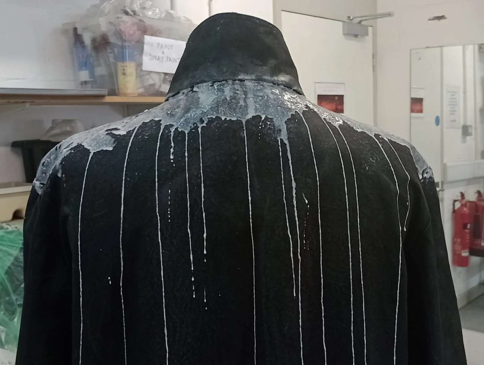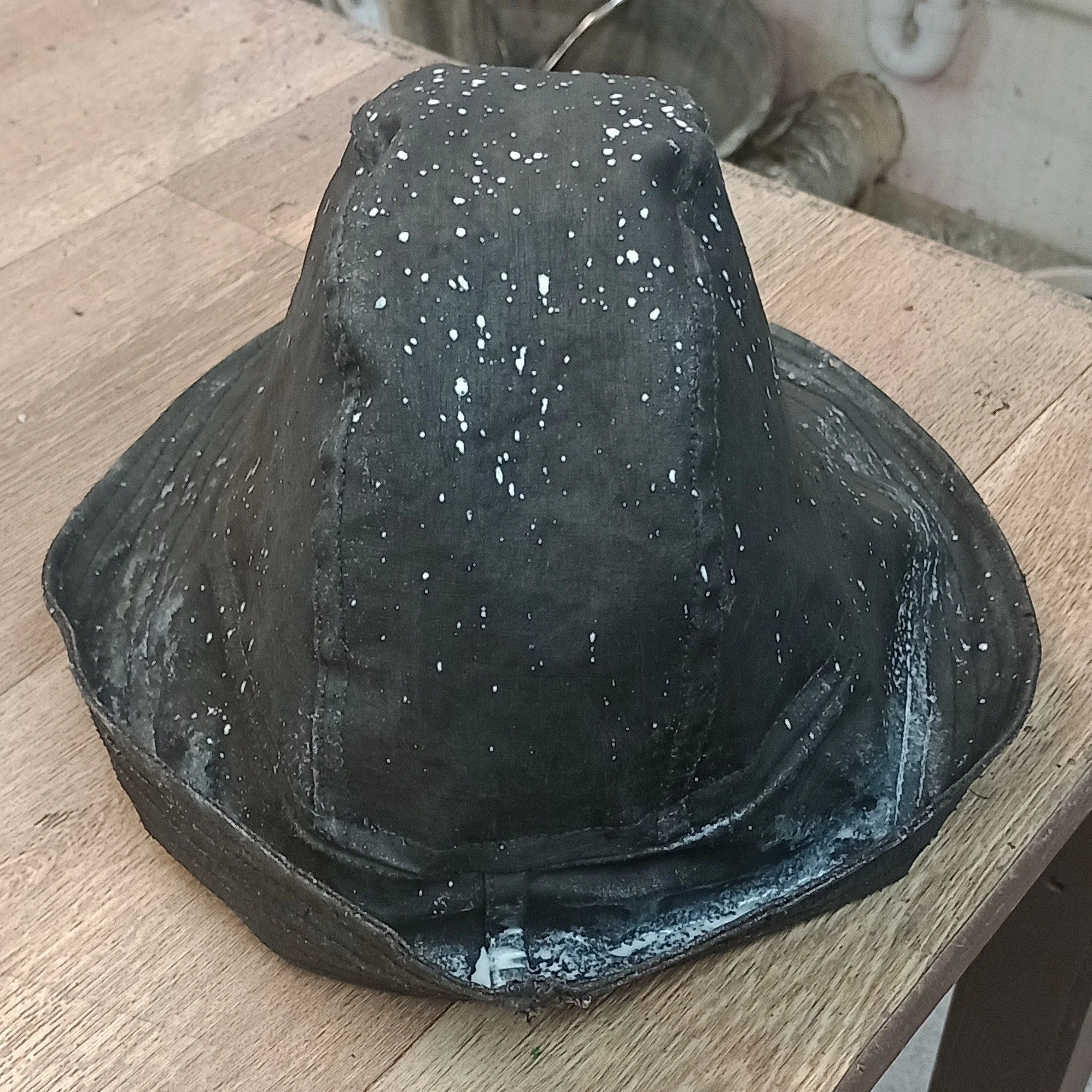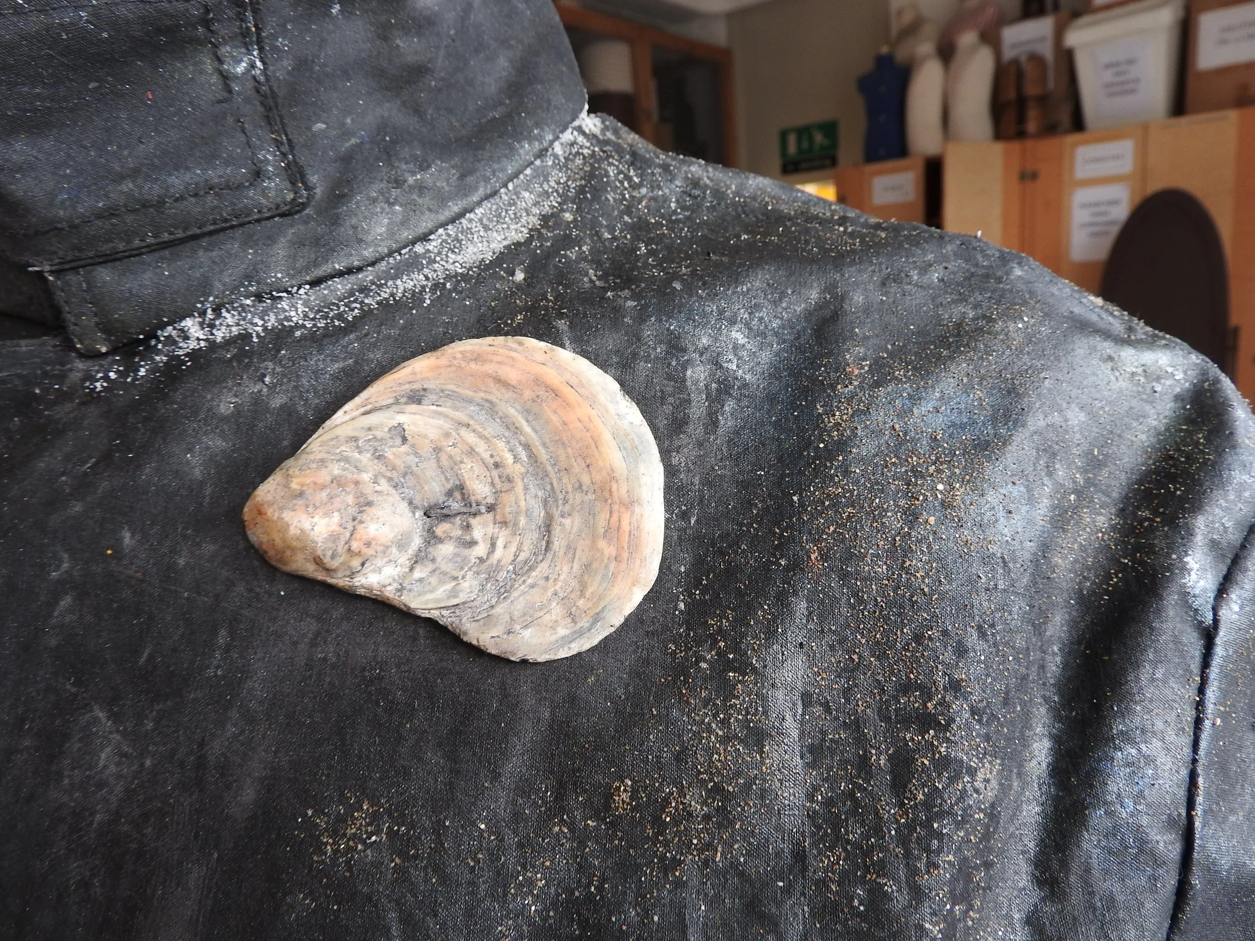 Breakdown on The Flying Dutchman; weathering from his long years at sea, roughly mended areas, salt bleaching, sand and barnacles clinging to the oilcloth and a treatment to create ‘wet’ areas, drips and spray splatters.